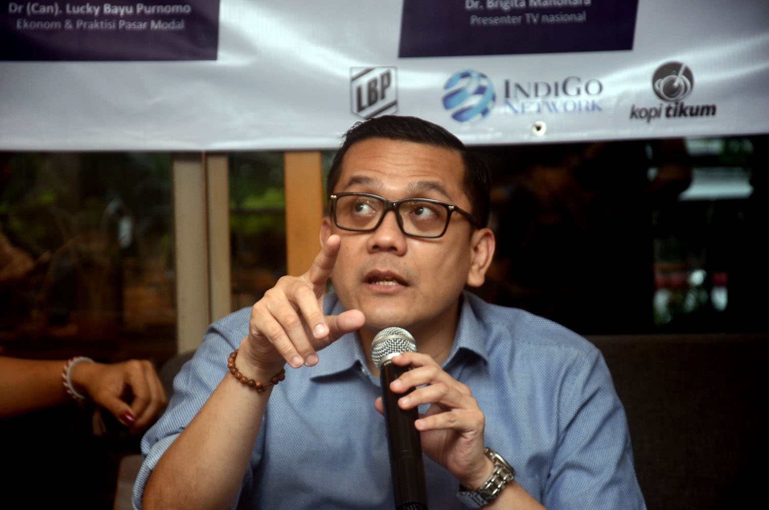 Ekonom dan Praktisi pasar modal Dr. (can) Lucky Bayu Purnomo (kanan) bersama Pakar Hukum Dr. Radian Syam (kiri) saat menggelar diskusi dengan tema Pemilu 2024 dan Ancaman Resesi Ekonomi di Kopi Tikum, Jakarta, Jumat (26/11/2022).