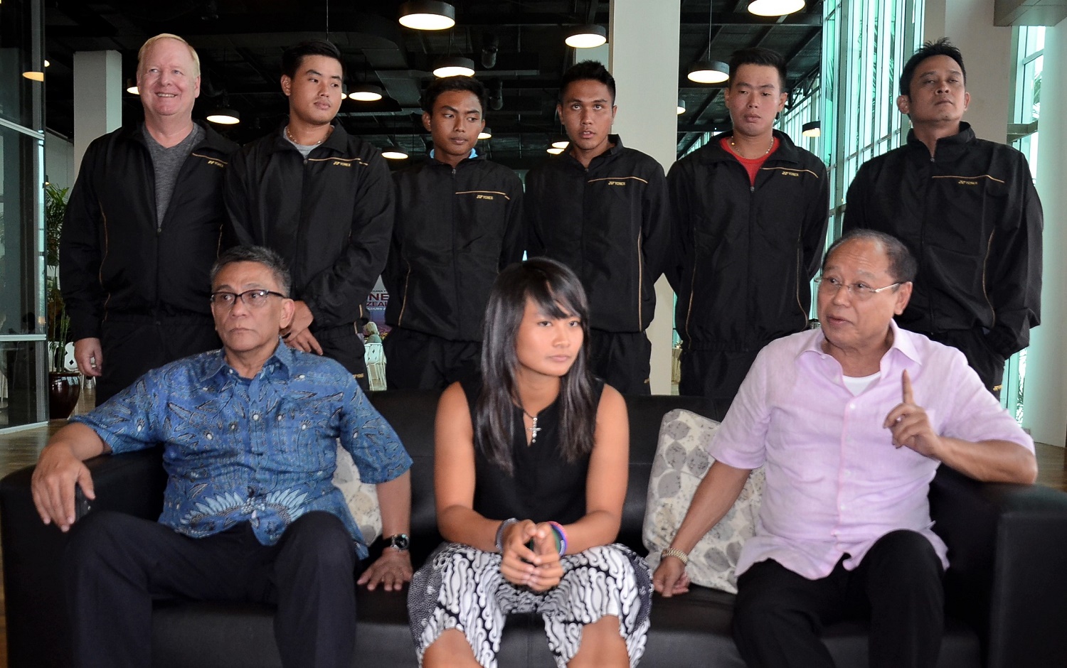 Ketua Umum Pengurus Pusat Persatuan Tenis Seluruh Indonesia (PP Pelti) Rildo Ananda Anwar (kedua kanan) bersama Penasihat PP Pelti Djan Faridz (kanan), Direktur Teknis Tenis PP Pelti Frank Frank van Fraayenhoven (ketiga kanan). bersama para atlit tenis lapangan Sejumlah Atlit Tenis Lapangan bernyanyi bersama saat Silahturahmi Komunitas Tenis di Jakarta, Kamis (12/9/2019). Kegiatan ini untuk memberikan dukungan dalam rangka pertandingan group II zona Asia/Oceania Piala Davis Cup 2019, yang akan berlangsung 14-15 September di GBK Tenis Senayan.