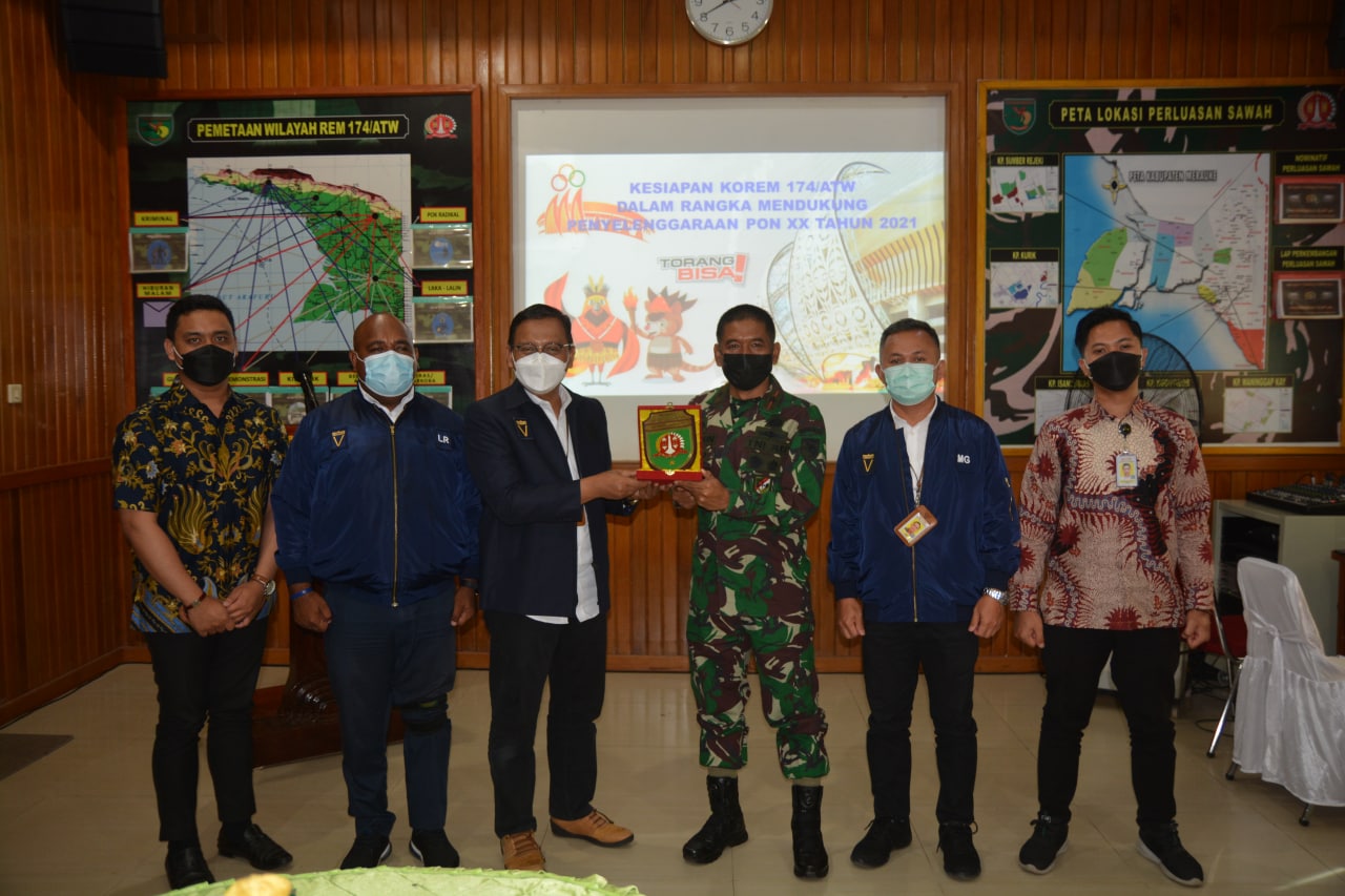 MERAUKE, Teritorial.com – Danrem 174 Merauke Brigjen TNI Bangun Nawoko didampingi Kepala Staf Korem Kolonel Arh Hamim Tohari, M.A., para Kasi Korem, Letkol Czi Muh. Rois Edy Susilo, S.T. (Dandim 1707/Merauke) dan Letkol Inf Ferizal R., S.I.P. (Danyonif 757/GV) menerima rombongan Tim dari Kantor Staf Khusus Presiden RI, guna memastikan kesiapan Korem 174/ATW dalam rangka mendukung kelancaran pelaksanaan PON XX Tahun 2021 di wilayah Kabupaten Merauke, bertempat di ruang Data Makorem, Jalan Poros Tanah Miring, Distrik Tanah Miring, Kab. Merauke, Papua, Selasa (23/4/2021).
