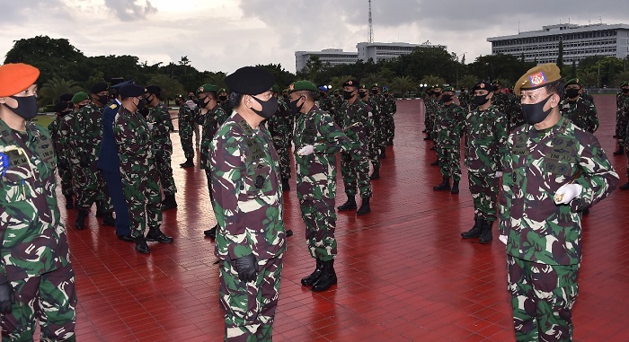 Jakarta, Teritorial.Com – Sesuai tradisi yang berlaku di lingkungan TNI, Panglima TNI Marsekal TNI Hadi Tjahjanto, S.I.P. menerima laporan pelaksanaan kenaikan pangkat satu tingkat lebih tinggi 79 Pati TNI terdiri dari 70 Pati TNI AD, 3 Pati TNI AL dan 6 Pati TNI AU, di Aula Gatot Soebroto, Mabes TNI, Cilangkap, Jakarta Timur, Rabu (20/5/2020).