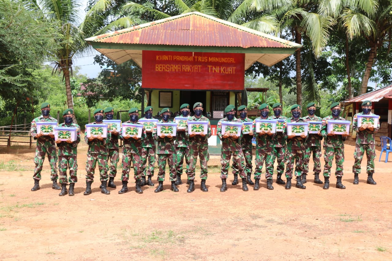 yang tersebar di 22 Pos Satgas mendapatkan 450 bingkisan yang dikemas dalam 450 box plastic, yang isinya terdapat 18 item.