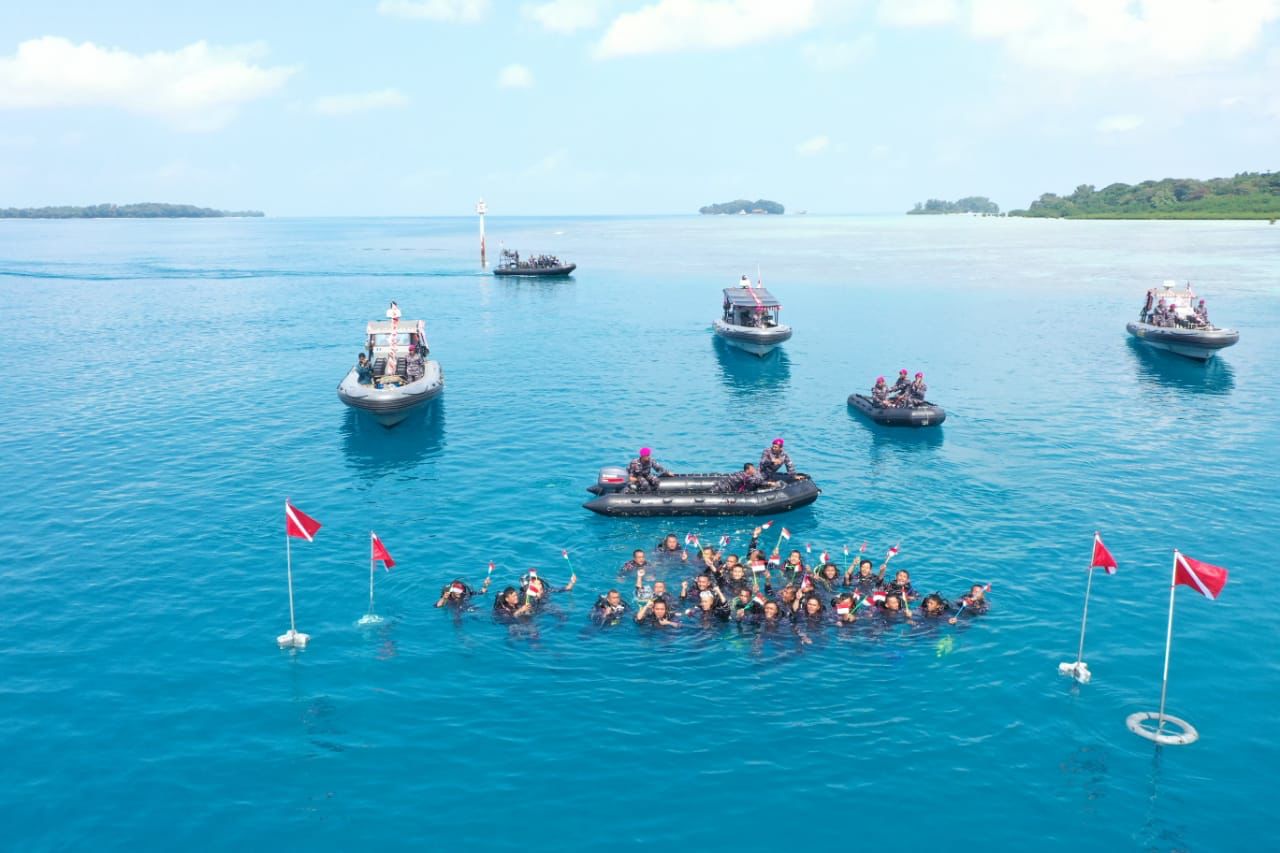 JAKARTA, Teritorial.com – Menyambut Hari Ulang Tahun (HUT) ke 77 Kemerdekaan Republik Indonesia, TNI Angkatan Laut (TNI AL) serentak mengibarkan Bendera Merah Putih dari bawah laut di 77 spot yang tersebar di seluruh Indonesia, upacara pengibaran bendera dipimpin Wakil Kepala Staf Angkatan Laut (Wakasal) Laksamana Madya (Laksdya) TNI Ahmadi Heri Purwono mewakili Kepala Staf Angkatan Laut (Kasal) Laksamana TNI Yudo Margono dipusatkan di Pulau Putri, Kepulauan Seribu, Rabu, (17/08).