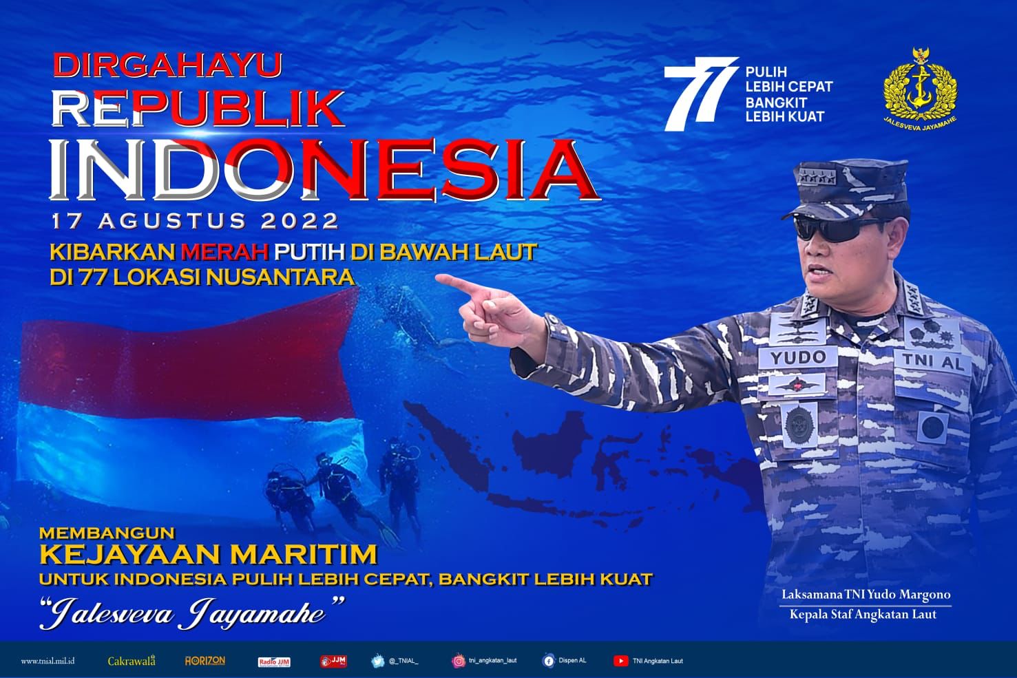 JAKARTA, Teritorial.com –Â Pengibaran bendera merah putih dalam upacara peringatan HUT ke-77 Republik Indonesia Tahun 2022, Kepala Staf Angkatan Laut Laksamana TNI Yudo Margono memerintahkan kepada seluruh jajarannya agar memeriahkan HUT ke-77 RI dan menguatkan semangat Nasionalisme, secara serentak untuk menggelar upacara dan mengibarkan bendera merah putih di bawah laut di 77 lokasi yang tersebar seluruh Indonesia pada Rabu, 17 Agustus 2022.