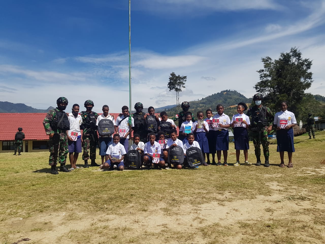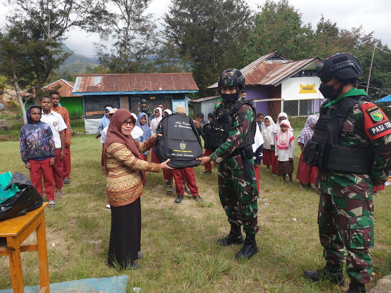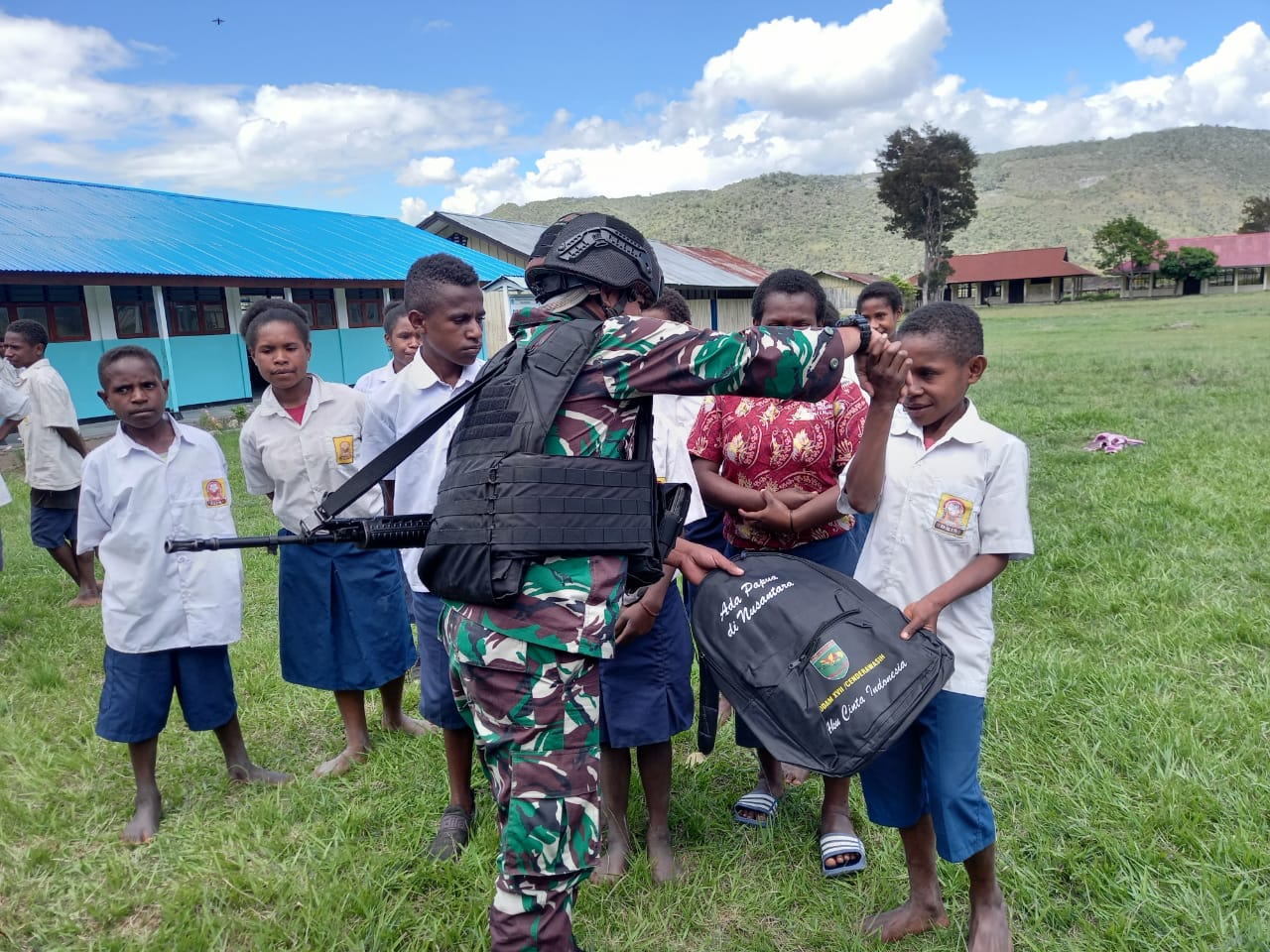 Peduli Pendidikan Terhadap Generasi Muda, Satgas TNI Bagikan Tas Sekolah Dan Alat Tulis